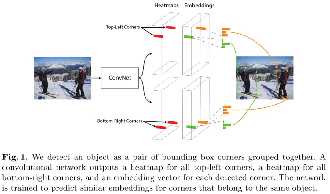 本文提出的CornerNet不需要anchor box。通过一个卷积网络预测每个类别所有实例bbox的左上角和右下角的热图(heatmap),以及每个角的嵌入向量(embedding vector),属于相同目标的嵌入向量更相似。网络的预测流程如图: