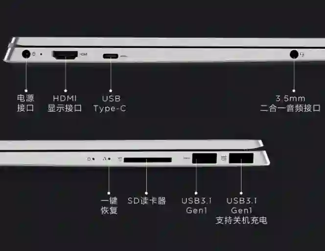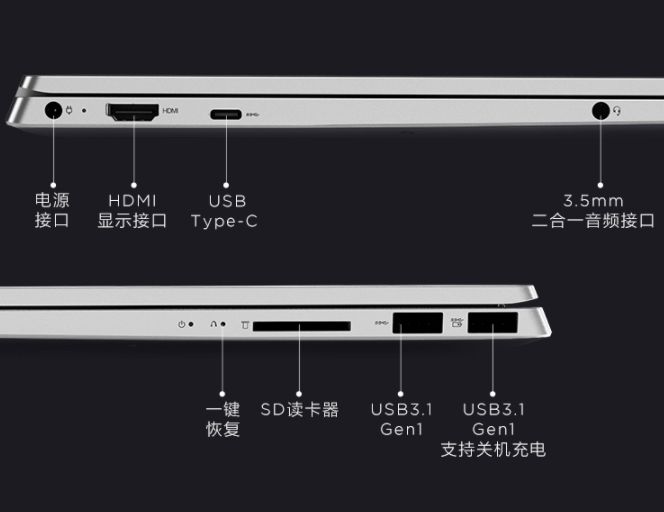 接口方面,联想小新Air15拥有两个USB3.1接口(其中一个支持关机充电),一个Type-C接口,一个HDMI接口,一个SD卡读卡器接口和3.5mm二合一音频接口。