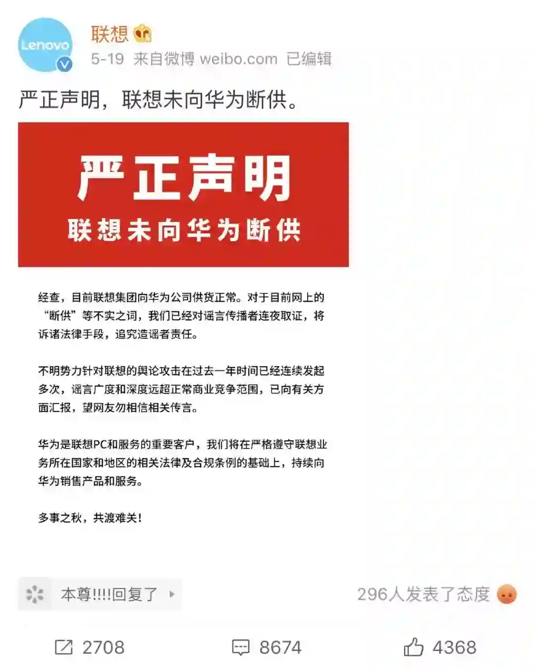 近日网络传闻联想断供华为,联想在深夜发布紧急声明予以澄清,仅仅两个小时后造谣者就公开道歉。
