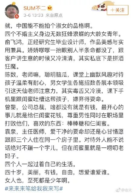 今年年初,一条关于性别转换版《绅士的品格》的长微博引起了不少网友的关注。博主说:“能不能拍个《淑女的品格》?讲述四个身边有无数狂蜂浪蝶的不婚主义者的故事,讲述四个人一起过各自的生活,美丽,有钱,自由,想爱谁爱谁。”