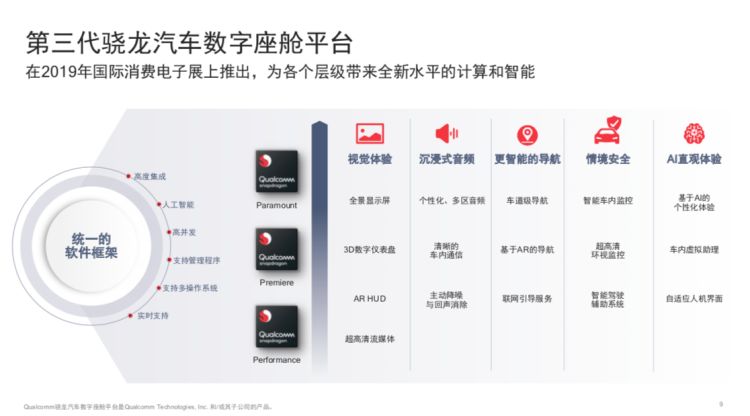 在CES 2019开展前夕,高通宣布推出第三代Qualcomm骁龙汽车数字座舱平台(Qualcomm Snapdragon Automotive Cockpit Platforms),该平台也面向了不同的三个等级:面向入门级的Performance系列、面向中端的Premiere系列以及顶级计算平台Paramount系列。