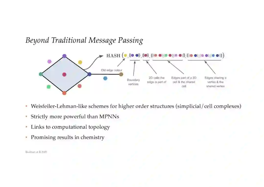 为复杂系统建模不仅需要图。2021 年的诺贝尔物理学奖授予 Giorgio Parisi,以表彰他对复杂系统的研究。虽然,这样的系统通常可以被基本地抽象为图。但我们有时必须考虑非成对关系和动态行为等更复杂的结构。2021 年的多项工作讨论了动态关系系统,并展示了如何将 GNN 扩展到高阶结构(如传统上在代数拓扑领域处理的细胞和单纯复杂结构)。我们可能会看到机器学习更多地采用该领域的其它思想。