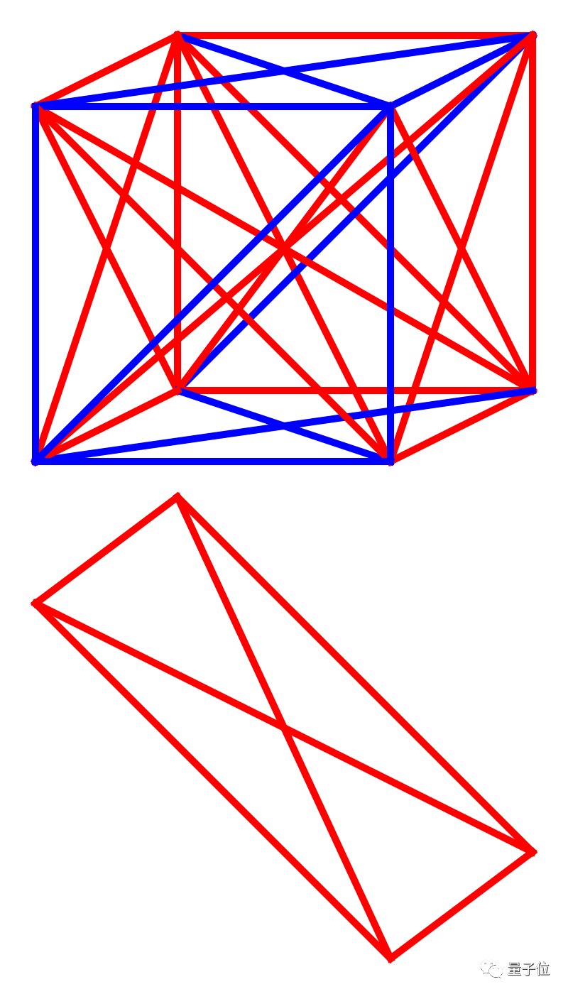 你注意到了吗?有一个斜的平面中有个单色完全图,可是如果我们把最下面的边换成蓝色,那么就不能在任意一个平面内找到单色完全图了。