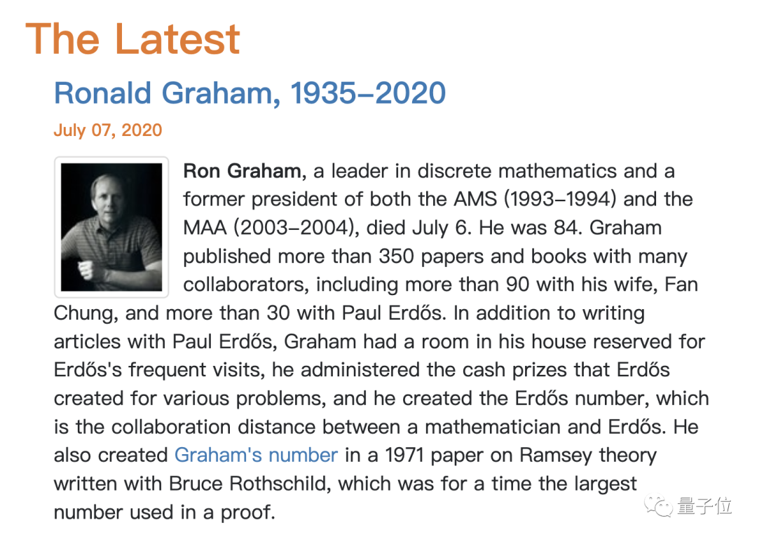 虽然很多数学爱好者不敢相信这个事实,但美国数学学会(AMS),已在官网发布了葛立恒的讣告: