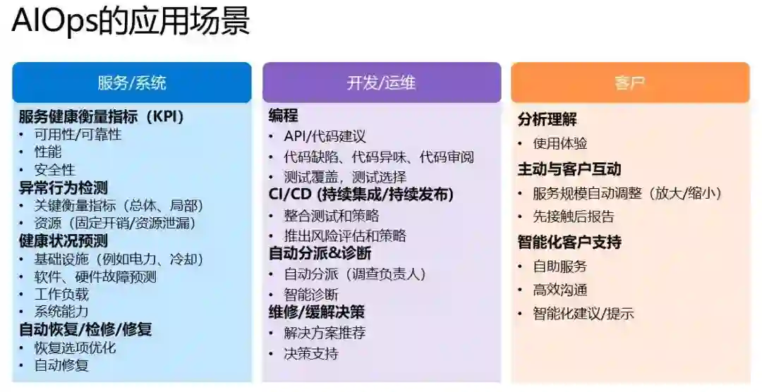 首先是系统服务,即 AI for System。云服务由部署了软件的数据中心系统为客户提供服务,软件必须要在云数据中心上运行起来,与云数据中心一起组成可运行的系统,才能对外提供云服务。而从可运行的系统角度来看,系统的性能、稳定性、安全性等各方面问题,都是需要研究的对象。其次是客户,即 AI for Customer。与互联网服务不同的是,云服务不仅服务于个人,更服务于企业,既然是为用户服务,一定要注重用户体验。即使系统再稳定,但用户体验不好的话,大家也不会选择云服务。第三是开发者,即 AI for DevOps,主要是面向开发人员和运维人员,用智能技术提高他们的生产率,让日常工作更顺畅。