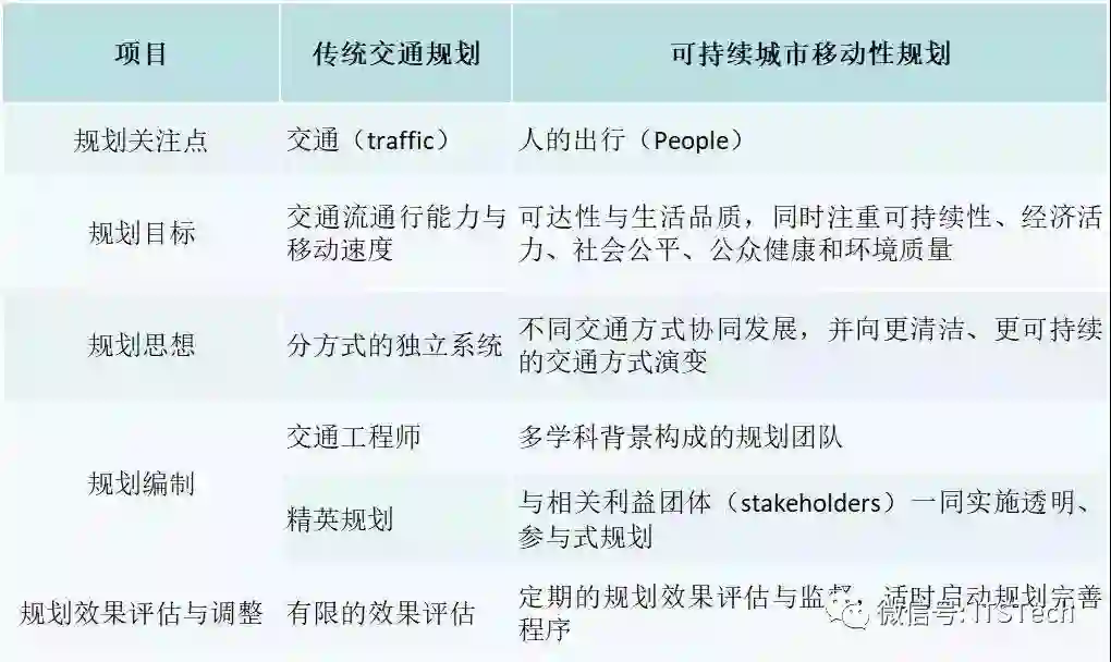 相对与国内交通评价侧重于车辆交通运行状态而言,国外更关注城市的移动性,即交通出行者交通选择的权利。这一点可以从下表的可持续城市移动性规划和传统的综合交通规划的区别中可以看看出。