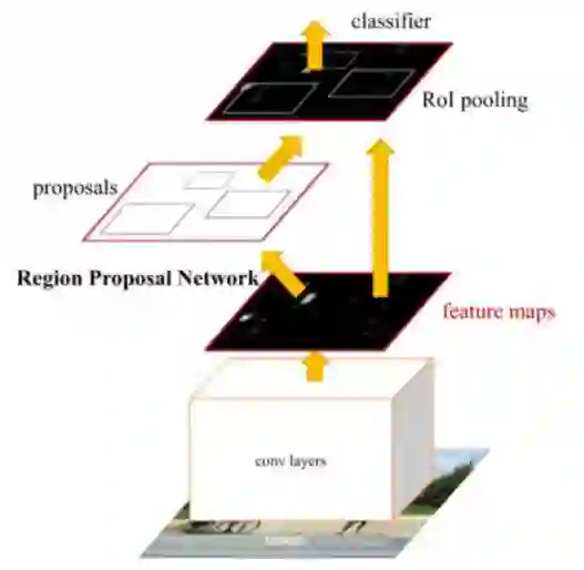 Faster R-CNN[12]:Faster R-CNN使用RPN网络代替了Selective Search方法,大大提高了生成Proposals的速度,具体实现策略同One-Stage检测算法,这里不再做过多赘述。网络示意图如下图所示。
