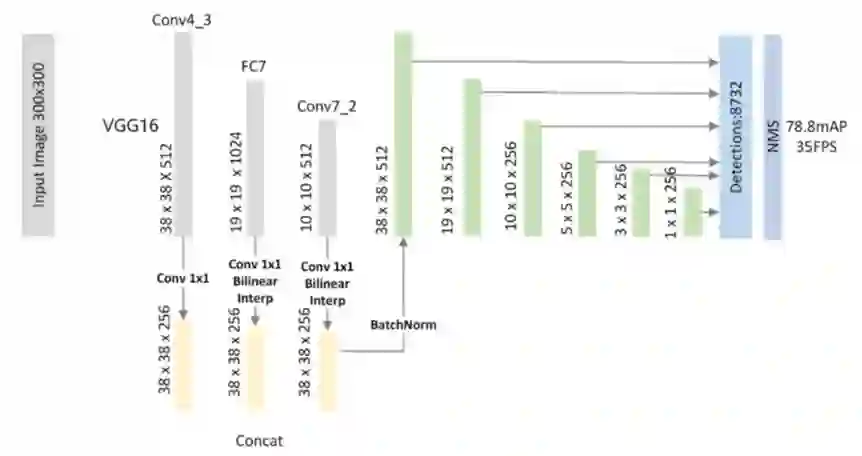 FSSD[7]:FSSD检测算法的网络结构如下图所示,同样,FSSD也是使用不同阶段不同分辨率的feature maps进行预测,相比于SSD,FSSD多了一个特征融合处理,将网络较低层的特征引入到网络的较高层,在检测的时候能够同时考虑不同尺度的信息,使得检测更加准确。