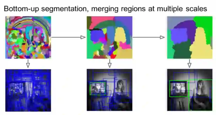R-CNN[11]:R-CNN生成Proposals的方法是传统方法Selective Search,主要思路是通过图像中的纹理、边缘、颜色等信息对图像进行自底向上的分割,然后对分割区域进行不同尺度的合并,每个生成的区域即一个候选Proposal,如下图所示。这种方法基于传统特征,速度较慢。