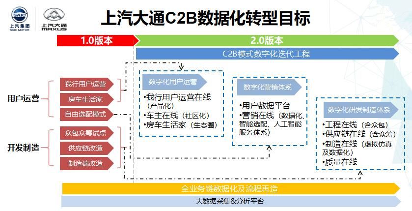 基于数字化平台,上汽大通通过全面数字化改造用户运营体系、营销体系和研发制造体系,实现了用户运营在线、营销在线、设计在线、制造在线、供应链在线和车在线等一系列在线。使用户可以与主机厂直接互联,提出产品需求、产品选配意向、进行下单和接受车辆。