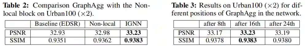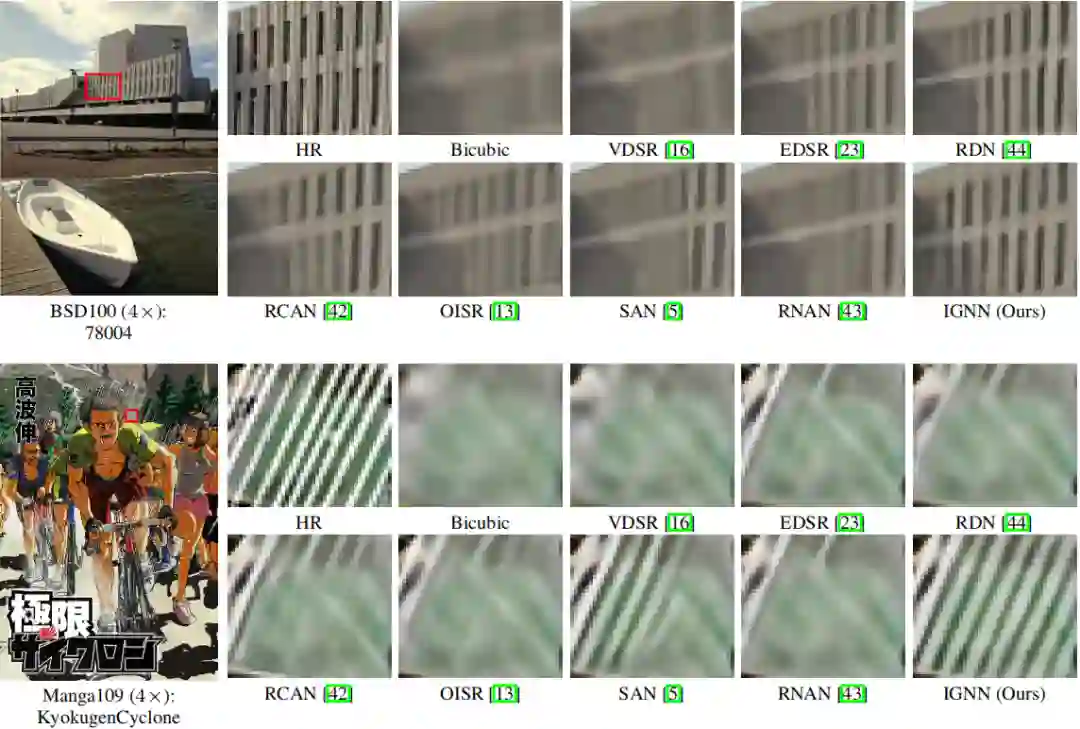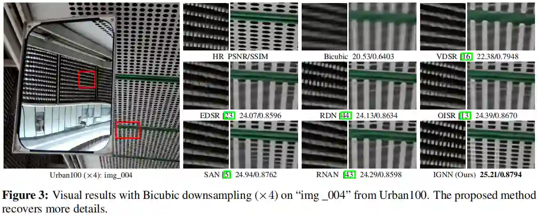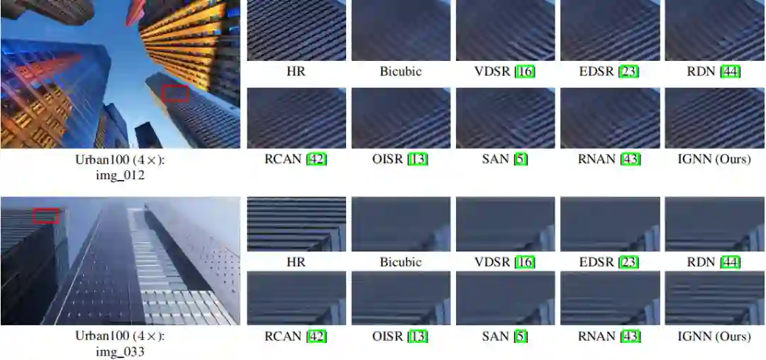 为验证所提方法的有效性,作者在DIV2K数据集上进行了训练,输入块大小为 ,同时采用随机镜像、旋转等增广。优化器为Adam,初始学习率为0.0001,每200000迭代折半,合计训练800000迭代。损失函数为 。在GraphAgg模块中,k=5,搜索窗口设置为30.注:GraphAgg是一种“即插即用”的模块,它可以轻易嵌入到其他超分网络中。