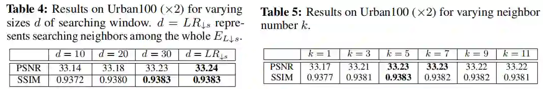 下面两个表分别对比了(1)不同搜索方位下的性能对比;(2)不同近邻数的性能对比。可以看到:搜索范围为30,近邻为5即可取得非常好的性能,进一步提升无明显提升。