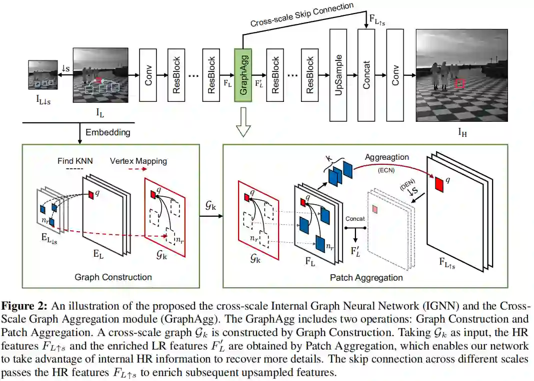 该文作者对自然图像中的跨尺度块相似块(即相似块可能出现在图像的不同尺度)进行探索,并提出一种新颖的Internal Graph Neural Network进行跨尺度的相似块探索,作者构建了一种跨尺度图用于为LR图像中的块搜k近邻相似块,得到k个HR近邻块并采用自适应集成方式进行信息汇聚。因此,HR信息可以通过k个HR近邻块传递给LR图像块并辅助图像纹理细节复原。