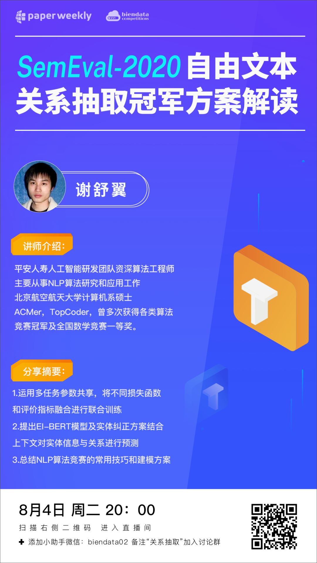 信息抽取技术是指从自然语言文本中抽取实体、属性、关系等信息,从而实现基于海量文本自动构建知识,是搭建复杂知识库系统的重要步骤。基于寿险业务特性,平安人寿 AI 团队主攻对话式机器人技术,对搭建高质量知识库具备极高要求。凭借丰富的技术积累和应用经验,团队在国际权威 NLP 大赛 SemEval-2020 中,以满分成绩夺得关系抽取赛道冠军。