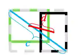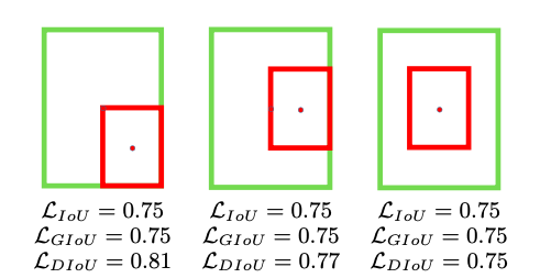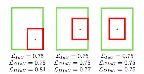 图 2、在这种情况下,GIoU的loss会退化为IoU的loss,而DIoU的loss仍然可以区分。绿色和红色分别表示目标框和预测框。