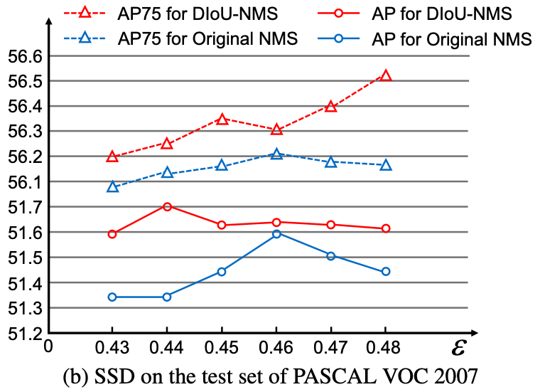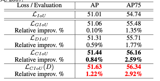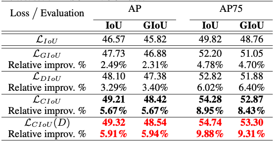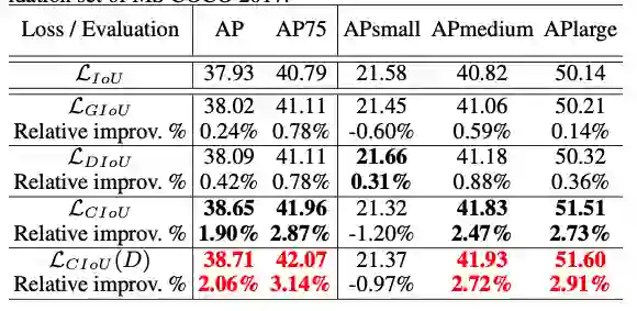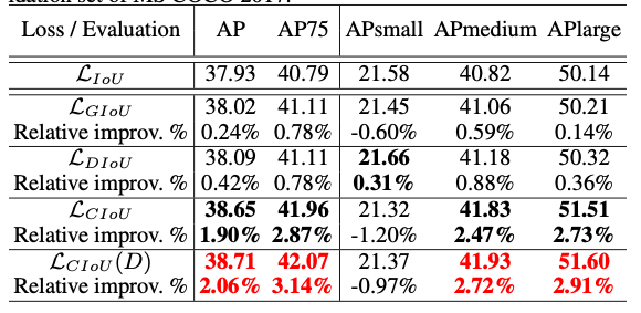 注意到,CIoU在小物体上的性能都有所下降,可能由于长宽比对小物体的检测贡献不大,因为此时中心点比长宽比重要。