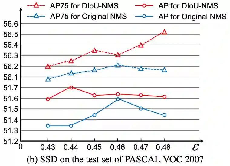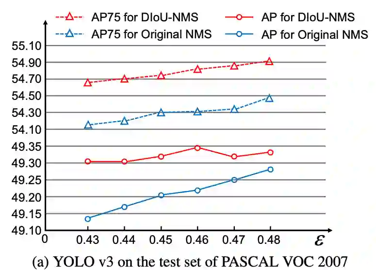 如图8所示,DIoU-NMS的整体性能都比原生的NMS效果要好。