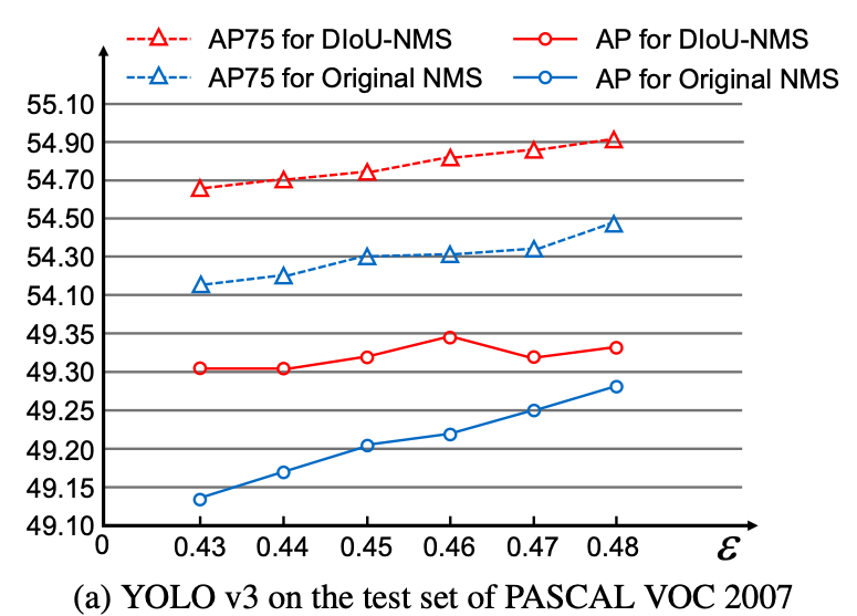 另外论文提出DIoU-NMS来代替原生的NMS,充分地利用IoU的特性进行优化,从实验结果来看,效果也是很好的。