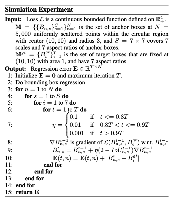 如图3所示,实验选择7个不同长宽比(1:4, 1:3, 1:2, 1:1, 2:1, 3:1, 4:1)的单元box(area=1)作为GT,单元框的中心点固定在(7, 7),而实验共包含5000 x 7 x 7个bbox,且分布是均匀的: