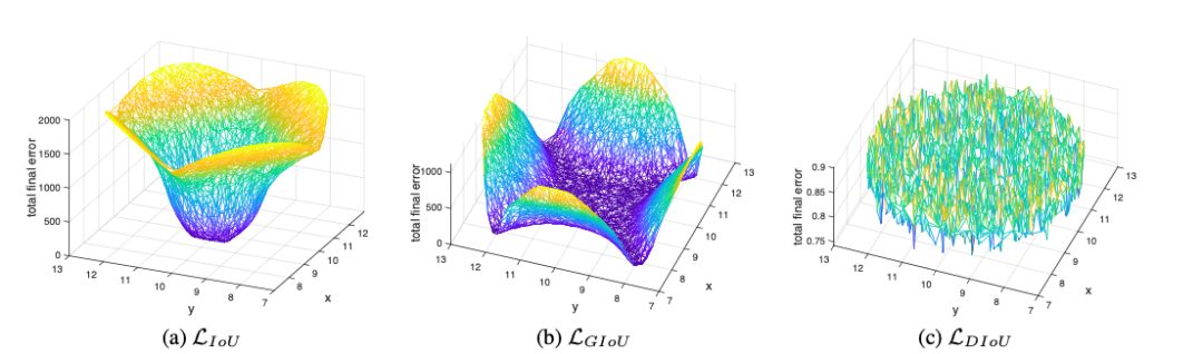 而GIoU由于增加了惩罚函数,盆地区域明显增大,但是垂直和水平的区域依然保持着高错误率,这是由于GIoU的惩罚项经常很小甚至为0,导致训练需要更多的迭代来收敛。