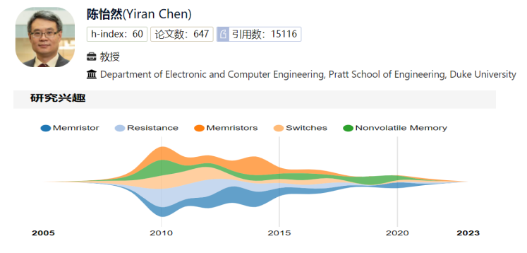 杜克大学电子和计算机工程(ECE)教授陈怡然因对新的非易失性存储器技 术及其应用的贡献而获得了 2022 年 Edward J. McCluskey。陈怡然教授在清华 大学获得本科(1998)及硕士(2001)学位,并在普渡大学获得博士(2005)学位。现 在的他就任杜克大学电子与计算机工程系正教授,并担任美国自然科学基金委 (NSF)新型可持续与智能计算(ASIC)企校合作研究中心(IUCRC)主任,及杜克计算进化智能中心(CEI)联合主任。