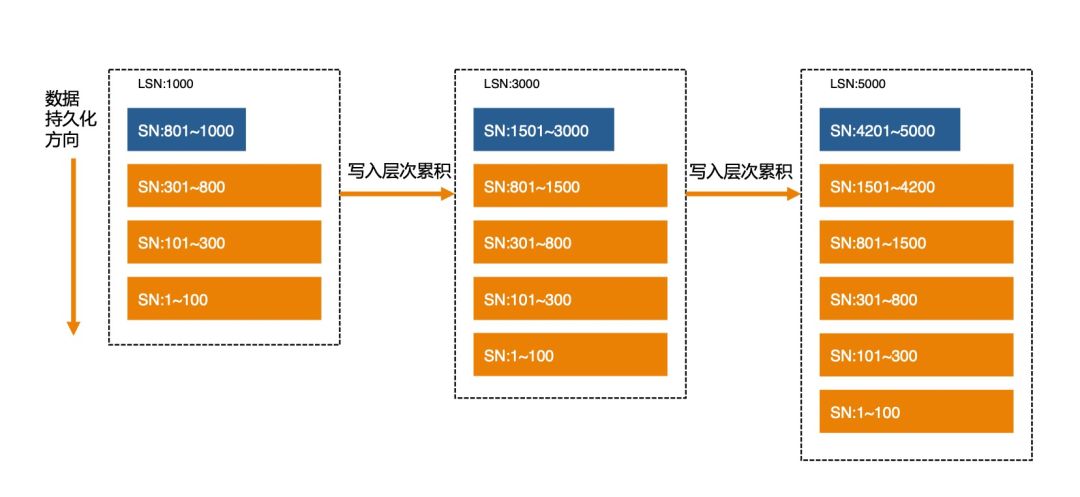 注意这里每一层的 SN 范围标识了事务写入的先后顺序,已经持久化的数据不再会被修改。每一层数据按 Key 排序,层与层之间的 Key range 会交叠。