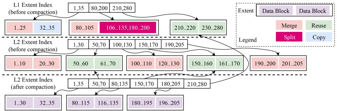 回看数据组织一节中"合并操作对元数据的改变", 对比"Metadata Snapshot2"和"Metadata Snapshot1"的区别,可以发现 Extent 的设计意图。是的,每次修改对结构的调整并不是全部来过,而是只需要修改少部分有交叠的数据,以及涉及到的"Meta Index"节点。