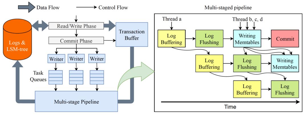 读写阶段需要校验事务的写写冲突,读写冲突,判断事务是否可以执行或回滚重试,或是等锁。如果事务冲突校验通过,则把修改的所有数据写入"Transaction Buffer", 提交阶段包括写 WAL,写内存表,以及提交并返回给用户结果的整个过程,这里面既有 I/O 操作(写日志,返回消息),也有 CPU 操作(拷贝日志,写内存表)。