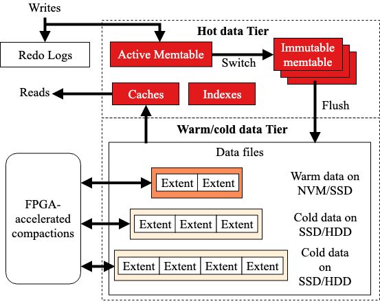 compaction 操作是比较重的。需要把相邻层次交叉的 key range 数据读出来,合并,然后写到新的位置。这是为前面简单的写入操作不得不付出的代价。X-Engine 为优化这个操作重新设计了存储结构。