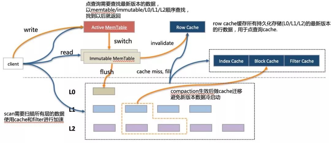 读操作中最核心的是缓存设计,Row Cache 来应付单行查询,Block Cache 负责Row Cache miss 的漏网之鱼,也用来应付 scan;由于 LSM 的 compaction 操作会一次大批量更新大量的 Data Block,导致 Block Cache 中大量数据短时间内失效,带来性能的急剧抖动。