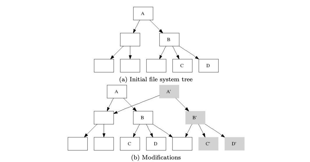 可以看到"Metadata Snapshot 2"相对于"Metadata Snapshot 1"并没有太多的变化,仅仅修改了发生变更的一些叶子节点以及索引节点。这个技术颇有些类似"B-trees, Shadowing, and Clones"(https://liw.fi/larch/ohad-btrees-shadowing-clones.pdf),如果你读过那篇论文,会对理解这个过程有所帮助。