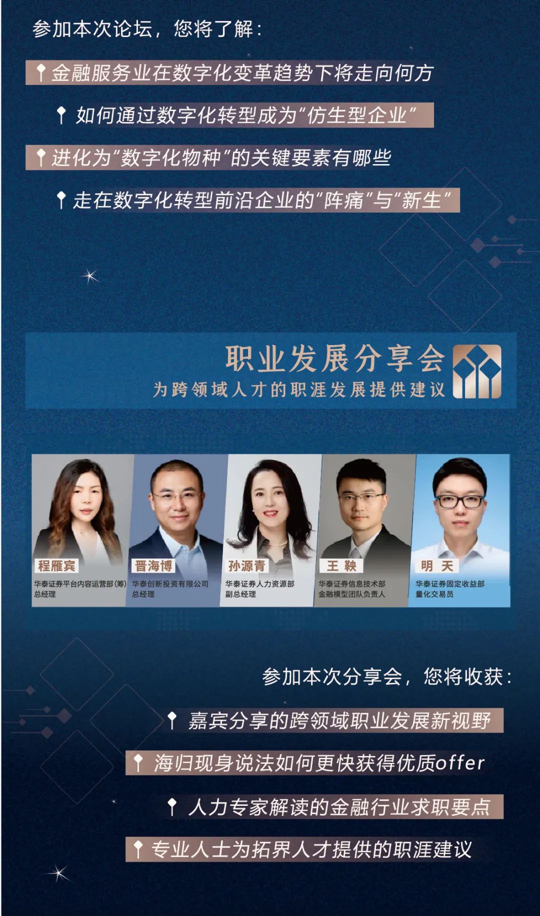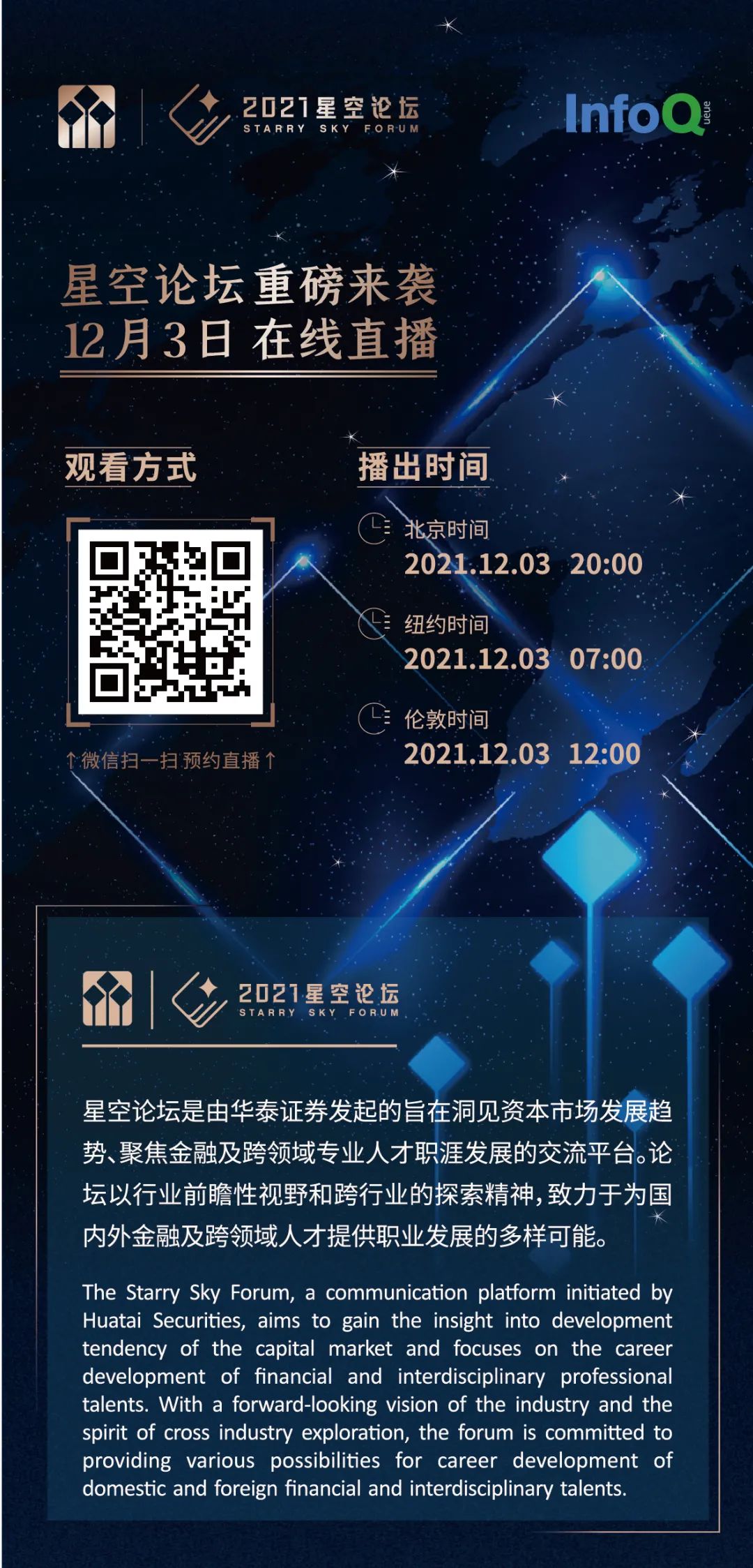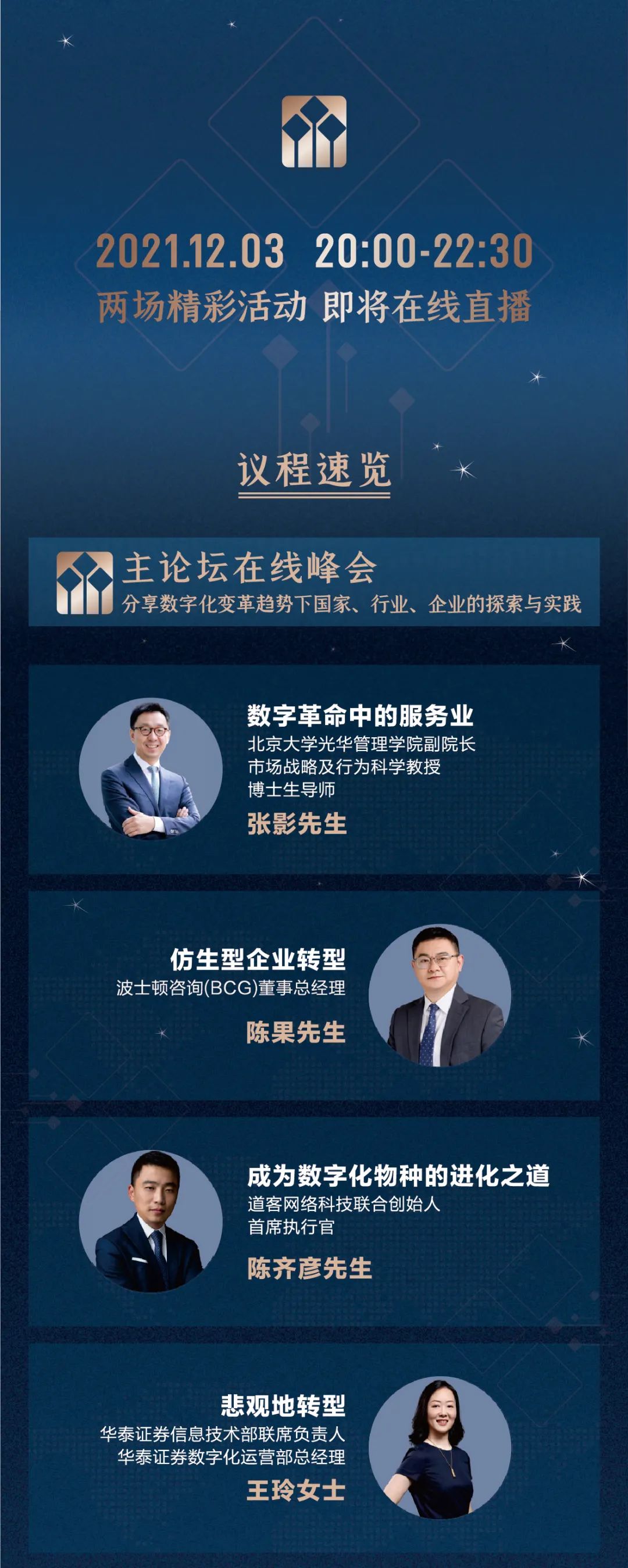 众说纷纭,我们究竟应该如何理解数字化转型?金融行业在数字化变革趋势下将走向何方?数字化转型前沿企业正在经历什么?12 月 3 日,2021 星空论坛将如期在线直播,邀请北京大学光华管理学院副院长、市场战略及行为科学教授、博士生导师张影;波士顿咨询(BCG)董事总经理陈果;道客网络科技联合创始人首席执行官陈齐彦以及华泰证券信息技术部联席负责人、华泰证券数字化运营部总经理王玲,探讨数字化转型浪潮下的金融行业发展方向。