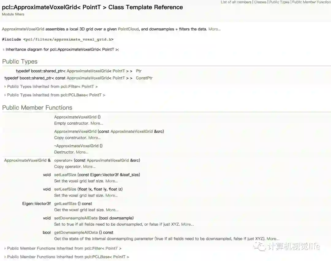 师兄:这个好问题,PCL官网上一般都有例程,但是例程包含的成员函数是很有限的,所以如果你想要了解这个滤波模板类的所有功能,或者说内联成员函数的话,最好的办法就是去官网查询。我们还是以pcl::ApproximateVoxelGrid 模板类为例进行说明