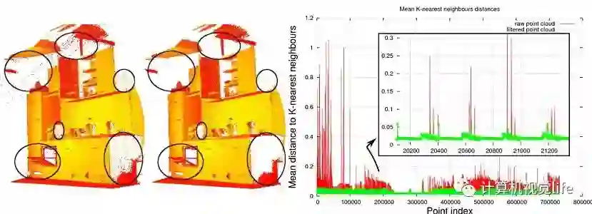 师兄:效果还是挺不错的,你看下图展示了稀疏离群值分析和移除的效果:原始数据集显示在左边,结果集显示在右边。图中红色表示滤波前的平均k近邻距离,绿色表示滤波后的平均k近邻距离,可以看到毛刺明显少了很多。