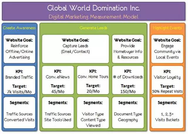 Avinash Kaushik,一位数字分析的专家,倡导采用框架的数字营销计量模型确保数据分析项目针对公司最重要的业务(请查看Avinash所整理的以下例子)。此外,你必须与高层有共识,不需太细,但在一页面总结明确的业务目标与实现。
