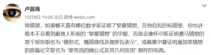 卢昌海猜测,如果哪天真有哪位数学家证明了黎曼猜想,在他自拟的标题里,你也许根本不会看到最耸人听闻的 “黎曼猜想” 的字眼,而是会像怀尔斯证明费马猜想的首个报告取名为 “模形式、椭圆曲线及伽罗瓦表示”,或佩雷尔曼证明庞加莱猜想的首篇论文取名为 “里奇流的熵公式及其几何应用” 那样的低调。