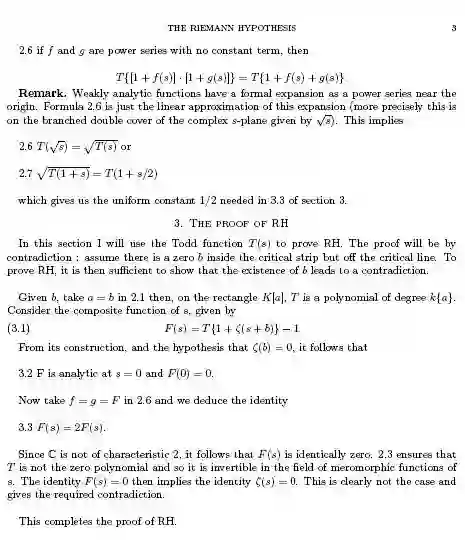 至于那篇题为 “黎曼猜想” (The Riemann Hypothesis) 的总计 5 页的 “疑似” 论文, 它是否是阿蒂亚爵士的正式论文,目前尚无定论,不过可能性不小,一是风格跟阿蒂亚爵士的近期论文比较相似,二是阿蒂亚爵士在报告末尾答听众问题时提到论文恰是 5 页。跟报告中的那一张透明片相比,论文稍体面些,但依然存在明显问题。拣小的说,几天前的通告中提到的狄拉克在论文中未曾出现,呈前言不搭后语之感;2.6 这个标号则出现了两次, 显得粗疏和草率。拣大的说, 从 2.6 到 3.3 这大半页的核心推理——也就是对黎曼猜想的 “证明”——完全推不动。而且哪怕姑妄读之,推特上也已有读者注意到,整个过程没有用到黎曼 ζ 函数的任何特殊性质,从而要么是错误的, 要么适用于在所讨论区域内解析性质相同的任何函数, 难不成所有那些函数的零点全归黎曼猜想管?