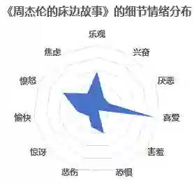 同样的,通过对比《跨时代》与最新的《周杰伦的床边故事》我们发现,市场认可度的回落重新刺激了周杰伦对周遭的不满,打抱不平的个性直接反映在了歌词中的愤怒情绪上。而随着恋爱、结婚以及生子等一系列人生历程,其性格逐渐软化,各项情绪指标都明显回落。