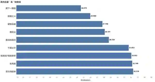 紧接着我们来看一下周董曲库中最悲伤的十首歌(见下图)。值得一提的是,在周董那些悲伤动人的歌曲中,讲述的并不单单是爱情故事,诸如《困兽之斗》与《最后的战役》也榜上有名,煽情但不滥情,为爱流泪但也不止为爱动容,这可能才是周董歌曲带给我们的别样感受。