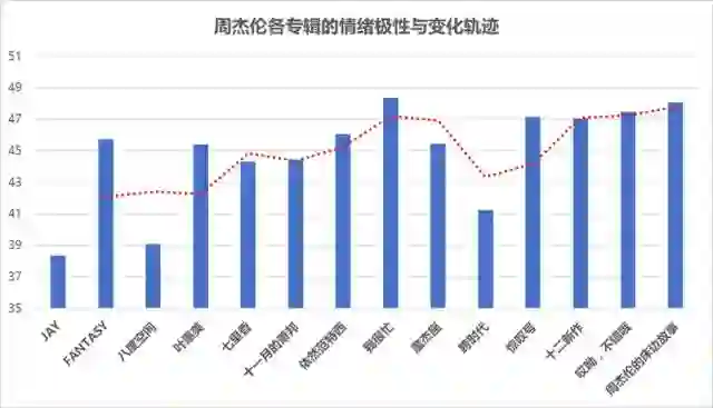 在所有14张专辑中,第一张同名专辑《JAY》的平均歌词情绪极性也是最低的,分值不足39分(50分以下即为负面情绪),而随着时间推移,后续专辑的情绪极性也在明显上升,这样的趋势直到2007年发行的《我很忙》达到顶点,而在之后两张专辑的情绪值却开始重新回落,直到2011年的《惊叹号》,专辑的情绪值才又进一步回升。