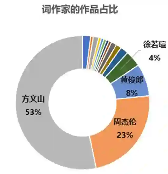 由上图可知,在周董所有的150首歌曲中,有将近90%来源于4位词作者,而所有歌曲中超过一半是由方文山操刀完成的。难怪如今方文山这个名字已经和周杰伦牢牢地绑定在一起,周杰伦如今的成就,很大一部分也归因于方大神充满意境、类型多变的歌词;除此之外,将近四分之一的歌词则是由周杰伦自己完成的,作词、作曲一把抓,周董“音乐才子”的称号果然并非浪得虚名;而另两位(黄俊郎与徐若瑄)则贡献了将近10%的歌词,其中则不乏《以父之名》、《可爱女人》等脍炙人口的经典好歌。