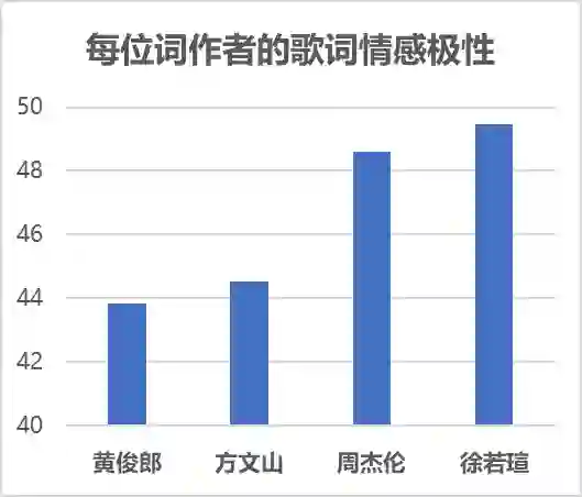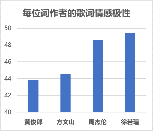 另一张图中展示了这四位主要词作者的歌词情感极性。都知道方文山的歌词意境隽永,悲戚感人,然而黄俊郎的歌词实际上更加阴暗晦涩,他的代表作是什么?《以父之名》与《夜的第七章》,意大利黑手党与苏格兰场,这样的歌词背景自然孕育除了神秘阴冷的歌曲意境;而四人中歌词最明亮的自然是徐若瑄,正所谓词如其人,徐若瑄的歌词与其在大众心中的形象类似,细腻而敏感,情绪温暖而明亮。
