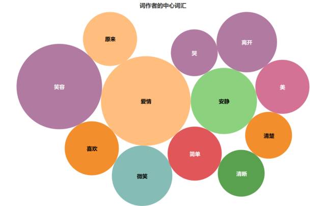 既然周杰伦的歌词内容包罗万象,那么其中是否存在什么共同的主题,或者内容上的偏爱呢?我们选取了前述的四位作家的歌词内容,根据语忆算法的关键词抓取功能,列出了下图中的这些“中心词汇”。所谓中心词汇,即那些在出现次数以及情绪浓度上都名列前茅的词汇。