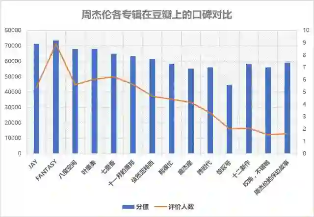 正如之前所言,专辑情绪的变化与歌手本人的情绪其实是存在对应关系的,因此小编推断周董本人的心境在17年间也经历了类似的变化过程。众所周知,自出道以来周杰伦每张专辑虽然都是“共襄盛举”,但专辑质量与关注度的下滑也是不争的事实。下图列示了14张专辑在豆瓣音乐上的评论量与评分,可以发现自《叶惠美》之后,专辑的掉粉与掉分速度都在不断加快,而这样的情况也一直持续到《惊叹号》后才有所好转