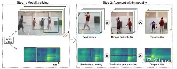 与图像自监督学习不同的是,多模态自监督学习需要同时考虑多种数据输入类型(图像和语音),并且利用他们的关联辅助学习。如图1,论文提出的方法主要包括三个步骤:1. 时序抖动,即从视频中随机选取一个时间起点;2. 模态选择和数据增强,选取一个特定模态进行数据增强;3. 跨模态对比学习。