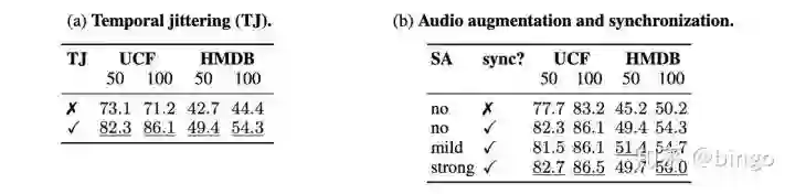 首先,如图3,通过ablation study,验证了时序抖动和语音、视频同步的重要性。