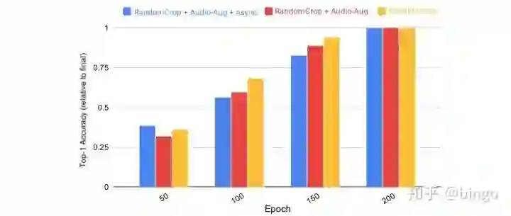 然后,如图4,作者严重了渐进课程学习的过程,即简单的变换比如随机裁切可以较快的学习,而多种复杂变换的组合学习速度较慢。