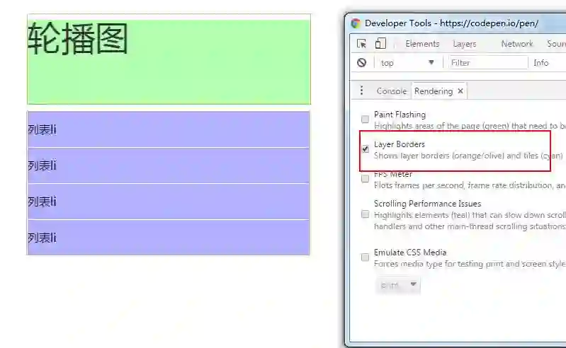 但是!在上面的图中,我们并没有给下面的 list 也添加任何能触发生成 Graphics Layer 的属性,但是它也同样也有黄色的边框,生成了一个独立的复合层。