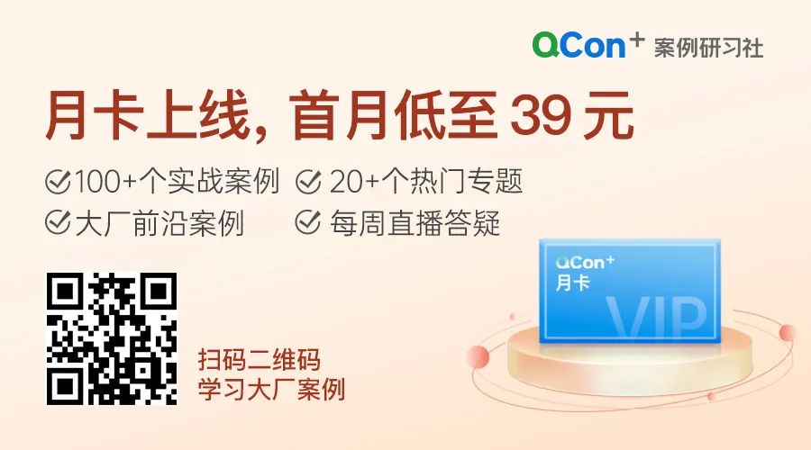 QCon+ 案例研习社全年汇聚 12 大领域 200 个大厂经典案例,每周上新可参考、能落地、有深度的前沿实战案例,让你足不出户与 200+ 行业专家线上近距离沟通、切磋,为那些你以为无解的难题,找到新方法。首次购买月卡仅需 39 元,扫码下方二维码了解更多。