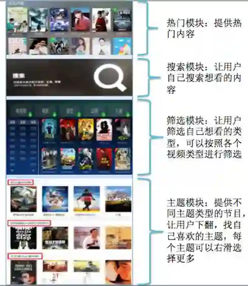 对于上述(1),搜索可以满足用户需求;对于(2),热播榜可以满足用户诉求;对于(3),筛选可以满足用户需求;对于(4),给出各种风格各异的内容,让用户快速选择自己喜欢的类型。